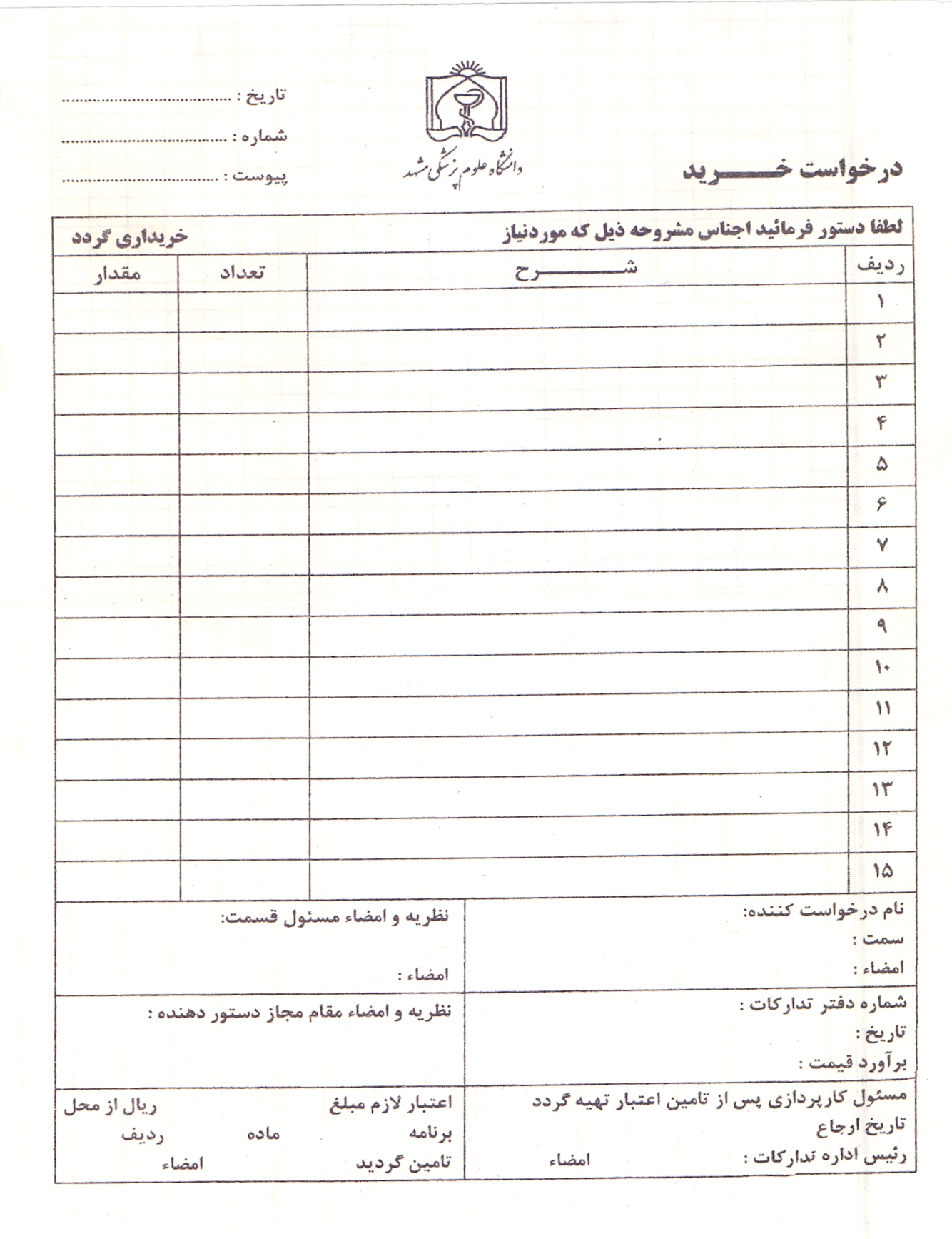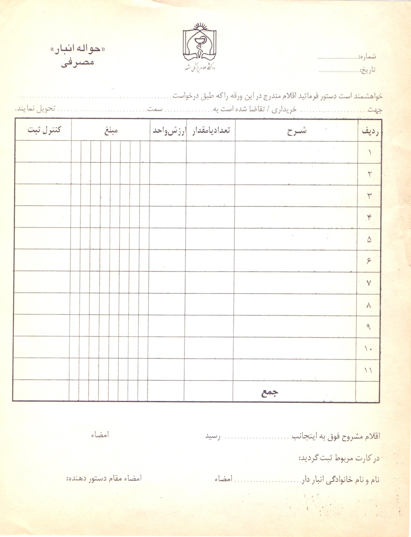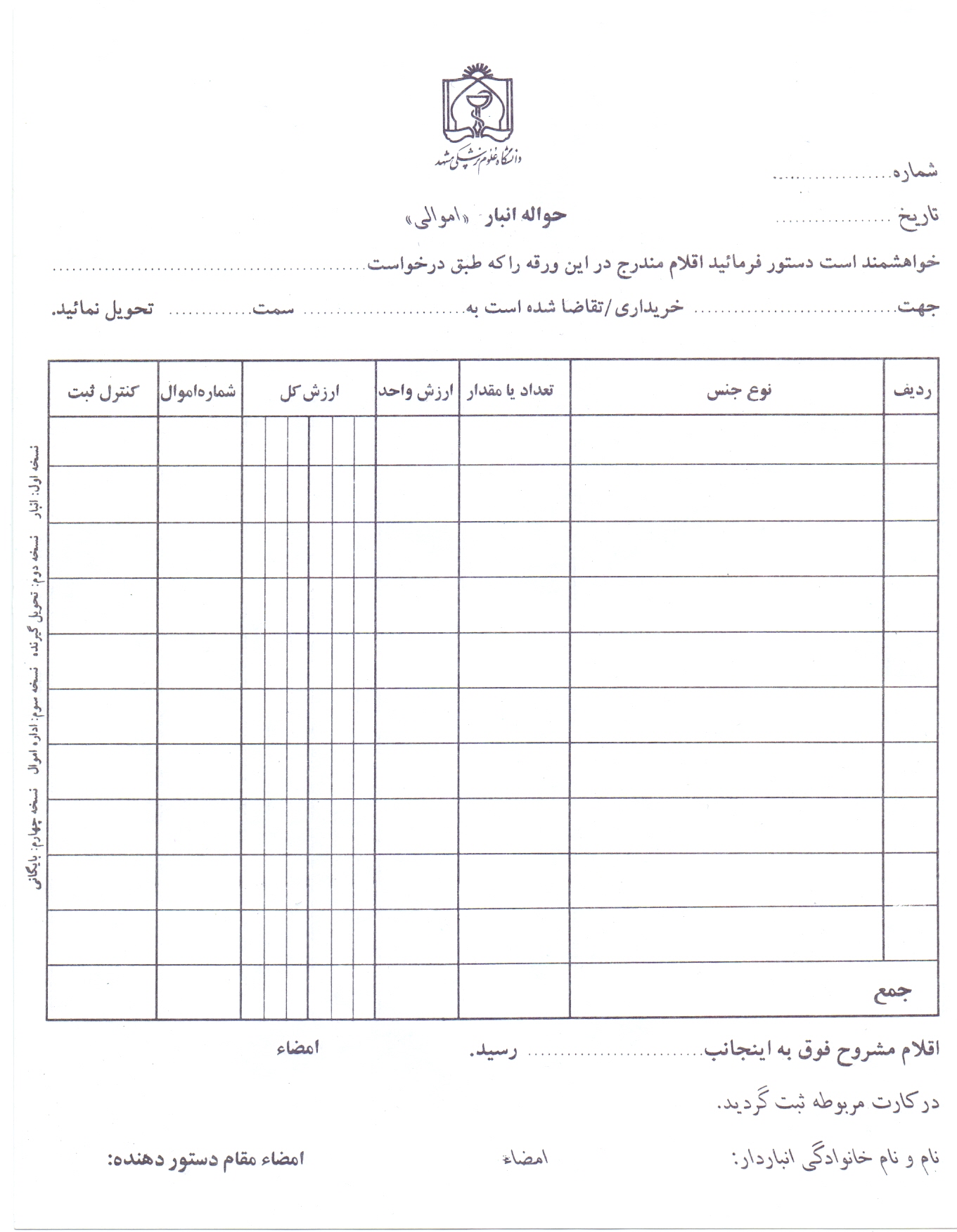 21 شهریور 1395 بازدید: 1760 فرم های مربوط به اداره انبار فرم های اداری 1 فرم درخواست خريد 2 فرم حواله انبار (مصرفي) 3 فرم رسيد انبار مصرفي