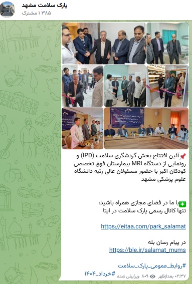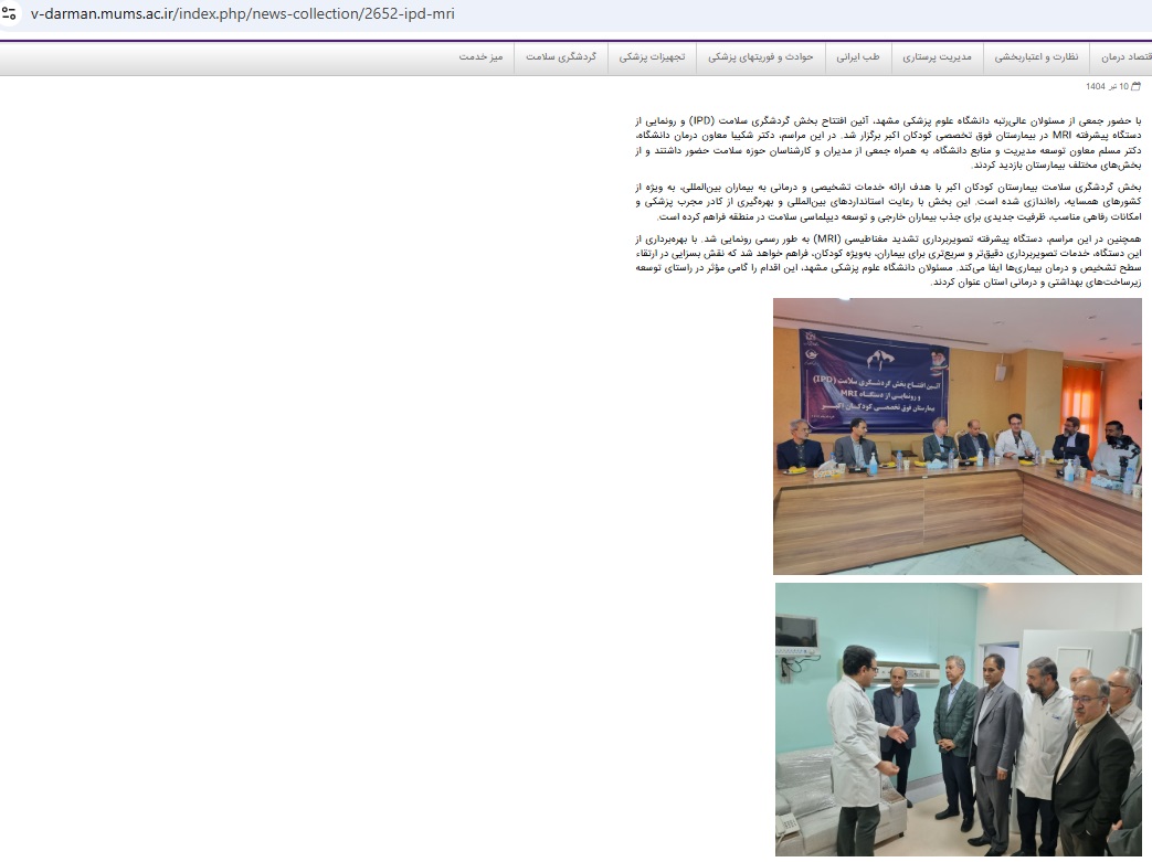 21 مهر 1404 بازدید: 25 آئین افتتاح بخش گردشگری سلامت (IPD) و رونمایی از دستگاه MRI بیمارستان فوق تخصصی کودکان اکبر با حضور مسئولان عالی رتبه دانشگاه علوم پزشکی مشهد انعکاس رسانه ای عکس اکرانهای شهری خبر وبدا شبکه های اجتماعی انعکاس رسانه ای عکس اکرانهای شهری خبر وبدا شبکه های اجتماعی انعکاس رسانه ای عکس اکرانهای شهری خبر وبدا شبکه های اجتماعی