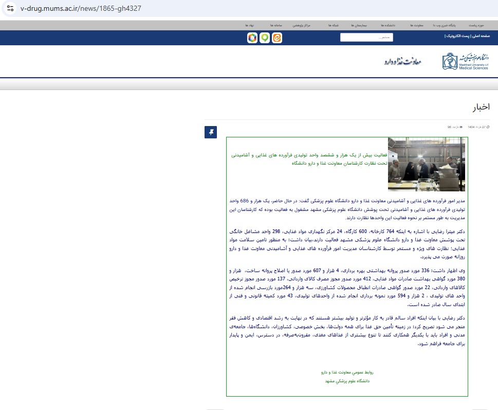 دکتر میترا رضایی با اشاره به اینکه 764 کارخانه، 600 کارگاه، 24 مرکز نگهداری مواد غذایی، 298 واحد مشاغل خانگی تحت پوشش معاونت غذا و دارو دانشگاه علوم پزشکی مشهد فعالیت دارند،بیان داشت: به منظور تامین سلامت مواد غذایی؛ نظارت های ویژه و مستمر توسط کارشناسان مدیریت امور فرآورده های غذایی و آشامیدنی معاونت غذا و دارو روزانه صورت می پذیرد.