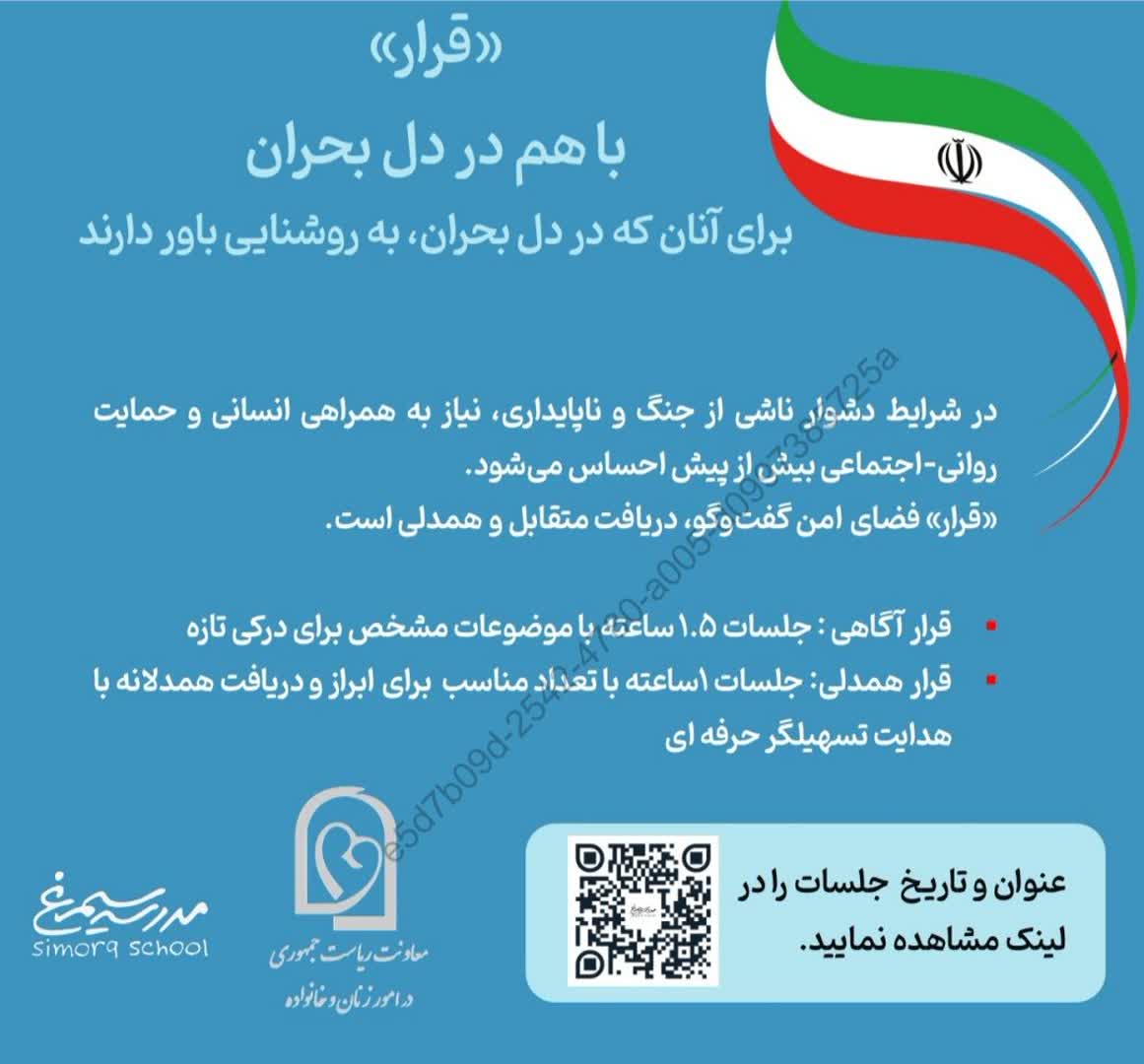 05 آبان 1404 بازدید: 20 ثبت نام دوره آموزشی انعکاس رسانه - خبر شبکه های اجتماعی عکس ها انعکاس رسانه - خبر شبکه های اجتماعی عکس ها انعکاس رسانه - خبر به منظور حمایت روانی _ اجتماعی از زنان و خانواده ها در شرایط بحران، با هدف ترمیم روانی، تقویت همبستگی اجتماعی و ارتقای احساس امنیت، برگزار می گردد. ثبت نام بانوان در دوره ها رایگان می باشد. شبکه های اجتماعی عکس ها