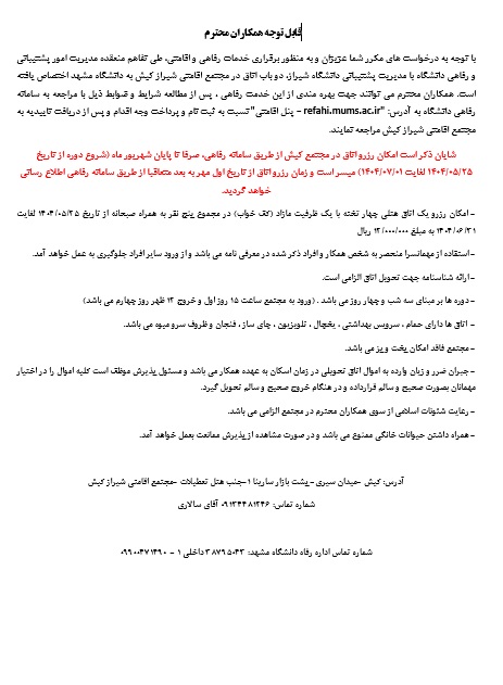 اطلاعیه خدمات رفاهی – مجتمع اقامتی شیراز کیش