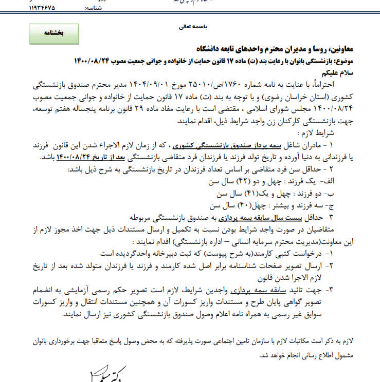 اعلام شرایط بازنشستگی بانوان بر اساس بند (ت) ماده ۱۷ قانون حمایت از خانواده و جوانی جمعیت
