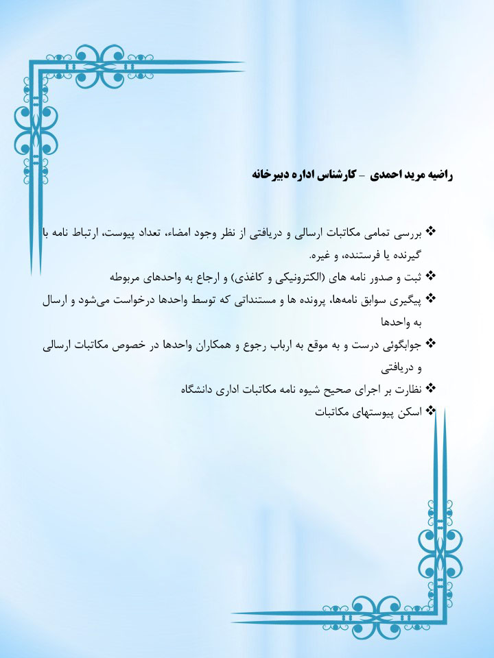 کارشناس اداره دبیرخانه دانشگاه (راضیه مرید احمدی)