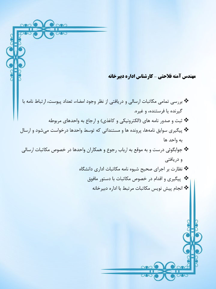 کارشناس اداره دبیرخانه دانشگاه ( آمنه فلاحتی)