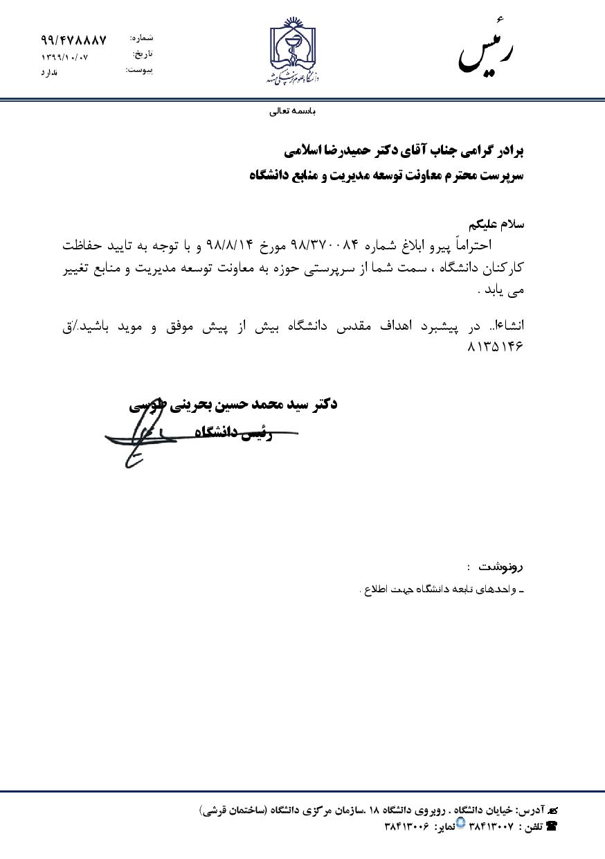 15 دی 1399 بازدید: 608 انتصاب دکتر اسلامی به سمت معاونت توسعه مدیریت و منابع دانشگاه توسط رئیس دانشگاه علوم پزشکی مشهد