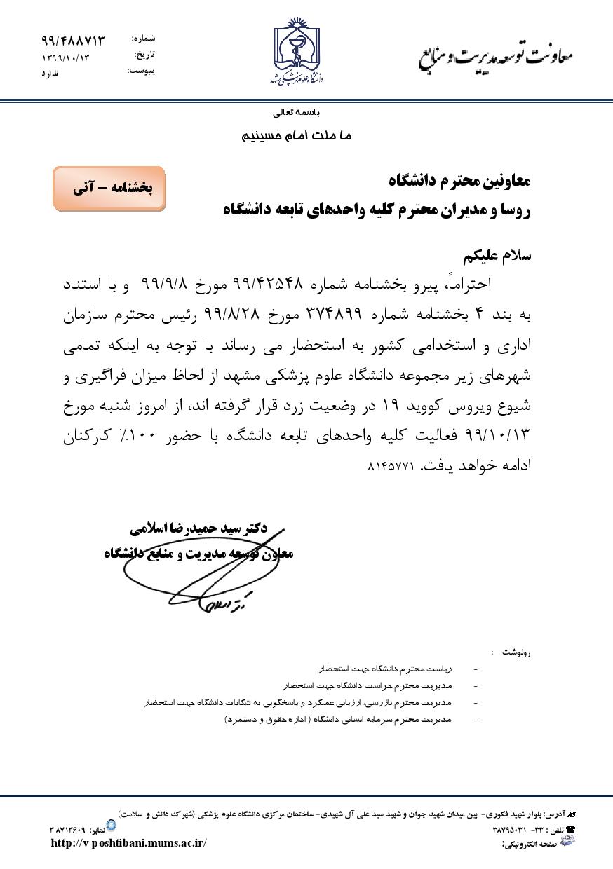 فعالیت کلیه واحدهای دانشگاه با حضور 100 درصد نیرو از مورخ 99/10/13