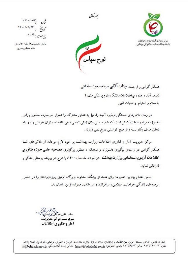 آقای دکتر علی شریفی، سرپرست مرکز مدیریت آمار و فناوری اطلاعات وزارت بهداشت و درمان با اهدای لوح سپاس از جناب آقای مهندس سید مسعود ساداتی ، مدیر آمار و فناوری اطلاعات دانشگاه علوم پزشکی مشهد تقدیر به عمل آورد. |