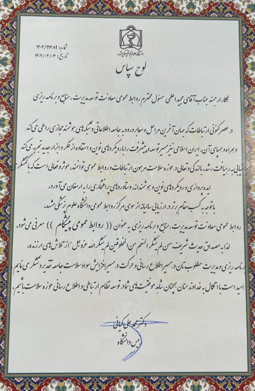 در بخشی از این نامه آمده است: به مصداق حدیث شریف مَنْ لَمْ يَشْكُرِ اَلْمُنْعِمَ مِنَ اَلْمَخْلُوقِينَ لَمْ يَشْكُرِ اَللَّهَ عَزَّ وَ جَلَّ از تلاش های ارزنده، برنامه ریزی و مدیریت مطلوبتان در مسیر اطلاع رسانی و حرکت در مسیر افزایش سواد و سلامت جامعه تقدیر و تشکر می نمایم، امید است با اتکال به خداوند منان همچنان شاهد موفقیت های شما در توسعه نظام ارتباطی واطلاع رسانی حوزه سلامت باشیم.