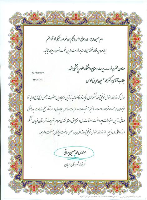 به گزارش وب دا، مهندس محمد حسین یساقی فرماندار شهرستان فریمان و نیز مهدی فروزان فرماندار شهرستان کاشمر ضمن اشاره به توجهات و عنایت خاص معاون مدیریت و منابع دانشگاه علوم پزشکی مشهد در ارتقاء سطح خدمات بهداشتی درمانی، از تأمین اعتبارات و پرداخت معوقات مالی و افزایش رضایت مندی مردم شریف شهرستان های فرمان و کاشمر تشکر و قدردانی نمودند. ایشان ابراز امیدواری کردند در سال 95 همچنان شاهد رشد و پیشرفت فرآیندها به منظور ارتقاء ارائه خدمات سلامت و درمان مردم شهرستان فریمان و کاشمر باشیم. |