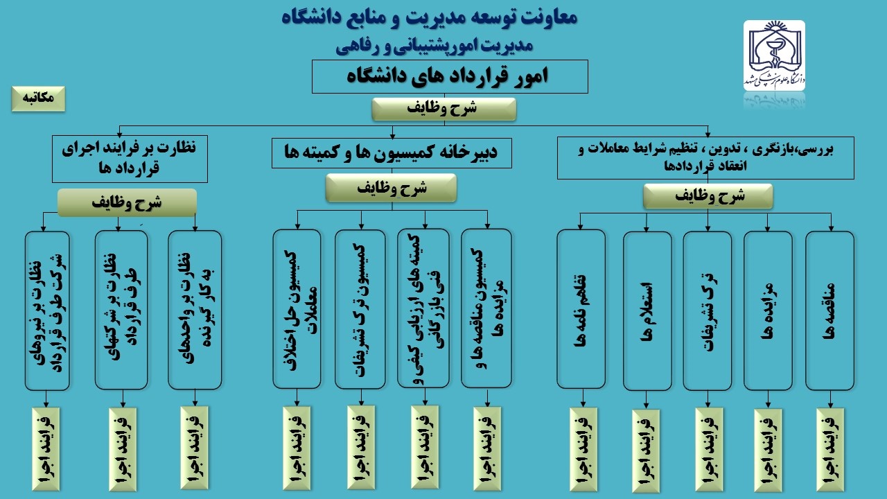 1. دبیری جلسات، برنامه ریزی، اولویت بندی، هماهنگی و برگزاری آنها 2. برنامه ریزی، سازماندهی، به کارگیری منابع، نظارت و کنترل امور مربوط به کارشناسان شاغل در دبیرخانه کمیسیون ها و کمیته ها 3. ثبت، بررسی و تکمیل مدارک درخواستهای مربوط به اختلافات و شکایت های طرفین قراردادهای منعقده با بخش خصوصی در سطح تمامی واحدهای تابعه دانشگاه جهت برگزاری جلسات و احاله آن به اعضای کمیسیون مربوطه 4. نظارت بر انجام صحیح و بهروزرسانی فرایندهای اجرایی کمیسیون ها 5. بررسی، امکانسنجی و فرایندسازی کاهش تمرکز امور اجرایی در ستاد مرکزی، توانمند سازی کارشناسان امور قراردادهای واحدهای تابعه و تفویض امور به ایشان 6. انجام امور الکترونیکی مربوط به معاملات در نصاب عمده دانشگاه و فراخوان های متناظر با آنان در سامانه تدارکات الکترونیکی دولت 7. انجام فرایندهای مربوط به بررسی مدارک و پیشنهادهای مناقصه/مزایده گران در جلسات بهمنظور تصمیمگیری اعضا 8. تنظیم ابلاغ کارگروههای کارشناسی و کمیته های نظارتی منتخب اعضای اصلی کمیسیون ها 9. هماهنگی و برگزاری جلسات کمیته های تخصصی ارزیابی کیفی پیمان کاران، فنی و بازرگانی کالاها و خدمات پیشنهاد شده، تجزیه و تحلیل قیمت ها و مبانی آن و ارائه گزارش های مربوطه 10. همکاری و هماهنگی با معاونت ها و مدیریت تخصصی دانشگاه در چارچوب سلسله مراتب اداری جهت دریافت بازخوردها و اعمال نظرات کارشناسی 11. تهیه و بهروزرسانی بانک اطلاعات الکترونیکی کمیسیون ها شامل جلسات برگزارشده به همراه مستندات مربوطه 12. تهیه صورتجلسات و گزارش های مربوطه در بستر سامانه تدارکات الکترونیکی دولت و سایر موارد مقتضی 13. تهیه پیش نویس مکاتبات مرتبط با سازمان های مدیریت و برنامه ریزی استان، اداره کل تعاون، کار و رفاه اجتماعی خراسان رضوی، وزارت صمت (سامانه تدارکات الکترونیکی دولت) و دیگر مراجع ذیربط در ارتباط با فرایندها و استعلام های مورد نیاز کمیسیون ها 14. تعامل و همکاری با سازمان های نظارتی از جمله سازمان بازرسی کل، دیوان محاسبات و سایر مراجع ذیصلاح با هماهنگی این مدیریت 15. برگزاری جلسات آموزشی در حوزه کمیسیون ها جهت کارشناسان امور قراردادهای واحدهای تابعه و دیگر مسئولین ذیربط در راستای یادگیری قوانین و مقررات، استفاده صحیح از سامانه تدارکات الکترونیکی دولت و رعایت مقتضیات قانونی آن